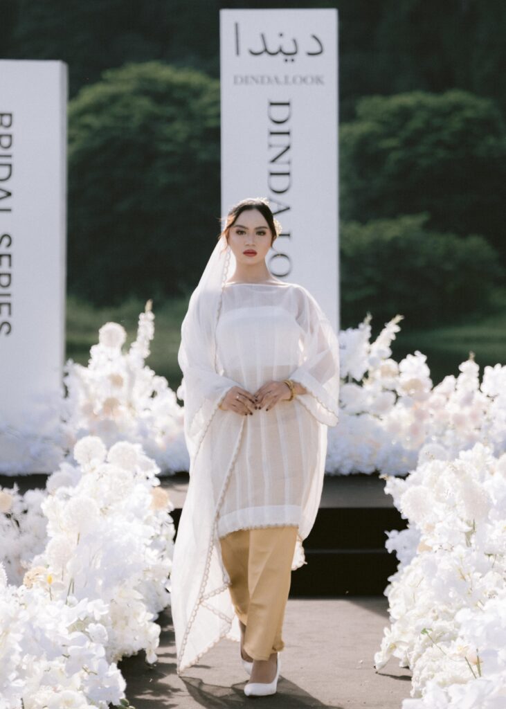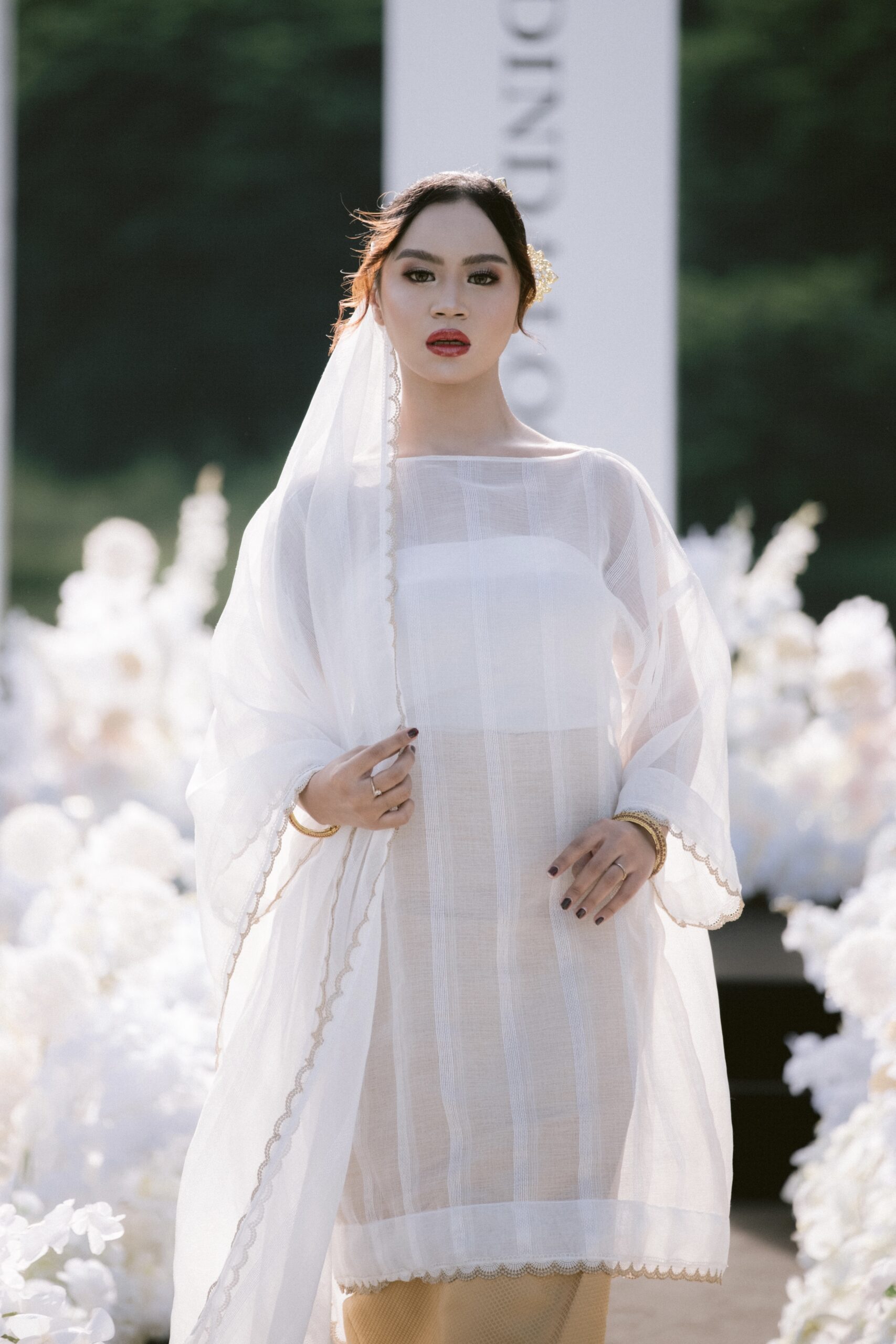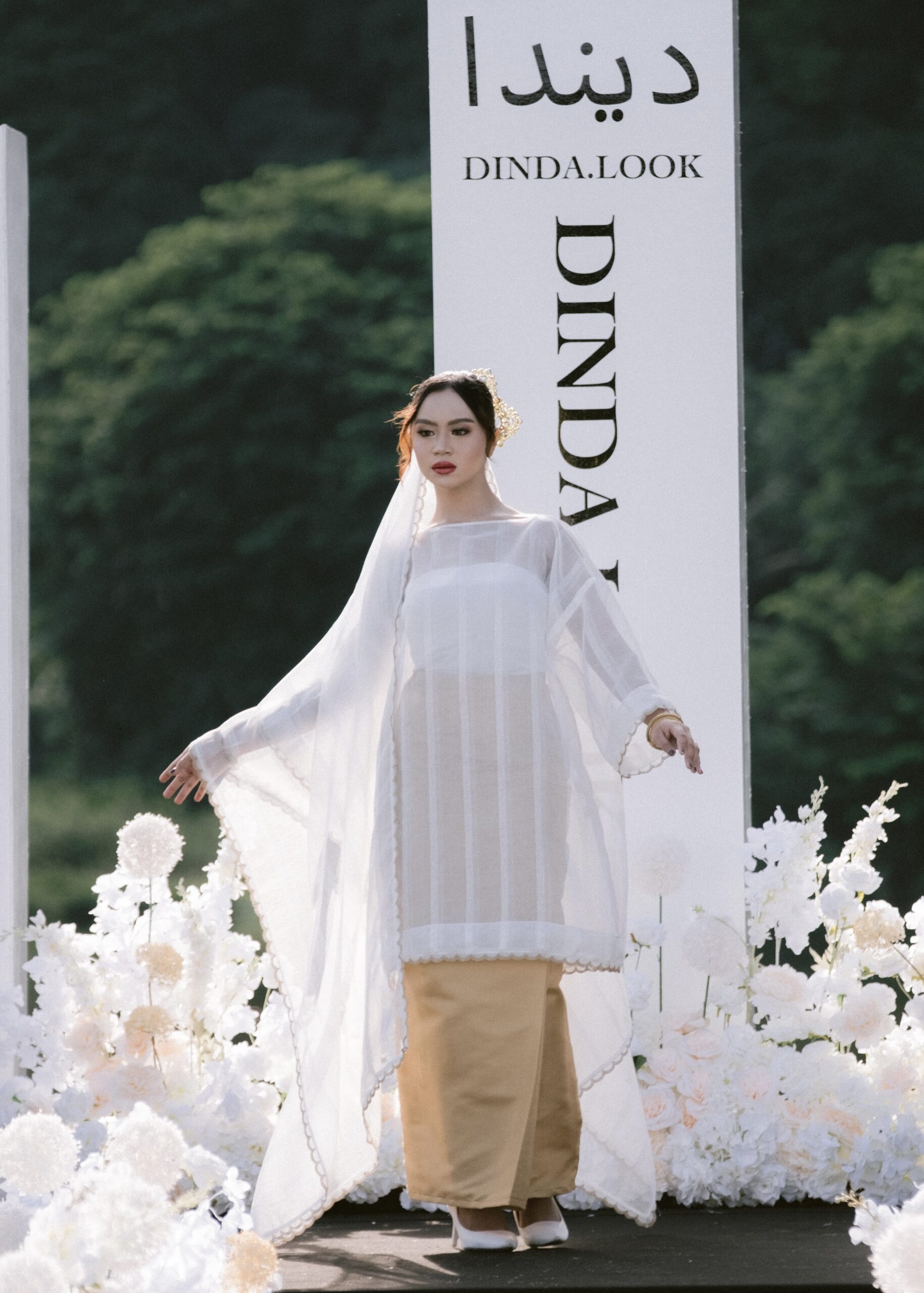 “Potongan kurung bodo, teguh dalam sejarah, diangkat mulia bersama selendang yang mengalun perlahan bak kabus dinihari.Dihiasi serpihan bersulam benang emas, seperti bunga yang berkembang diam-diam di celah redup bulan.
